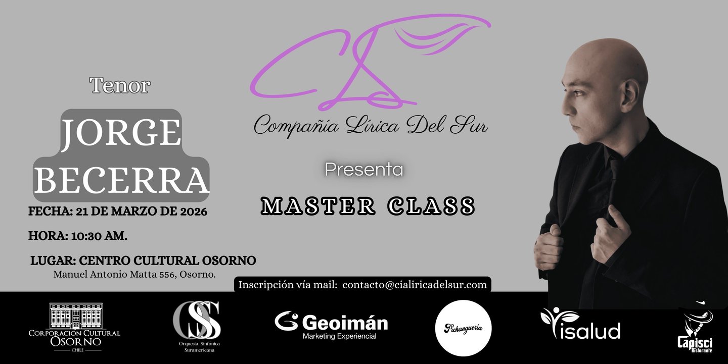 OSORNO, CHILE – El próximo sábado 21 de marzo, la ciudad de Osorno se convertirá en el epicentro del perfeccionamiento vocal con la llegada del reconocido tenor y pianista chileno, Jorge Becerra. El maestro dictará una Master Class exclusiva en las dependencias del Centro Cultural Osorno, brindando una oportunidad única para músicos y entusiastas de la lírica en la región.